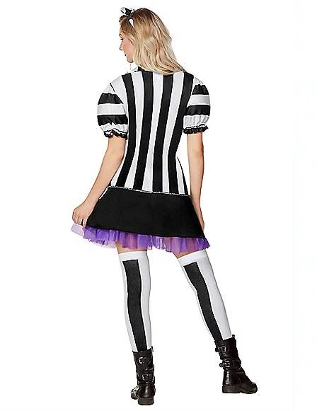 Dress up for the costume party as one of your favorite characters when you show up wearing this officially licensed Adult Beetlejuice Dress Costume. This costume is a unique twist on Beetlejuice’s iconic striped suit and is sure to get some heads turning at the party. Featuring a striped dress, socks, a headband, a tie, and decorative pins, with this costume on you”ll be ready for any celebration.Â