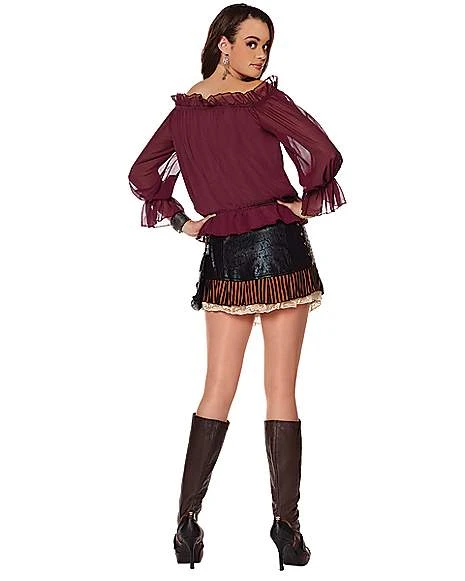 This burgundy top is fun, flirty, and ultra-flattering! Featuring sheer ruffles, loose sleeves that are gathered at the wrist, an off-the-shoulder style neckline, and a cinched waist, this top is perfect for your pirate look or other unique style.