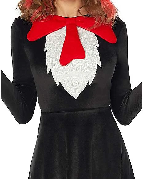 Look like you’ve stepped right out of your favorite children’s book in this official Dr. Seuss Cat in the Hat Dress! This look also comes with a matching headband featuring a mini red and white top hat and red and white striped socks to complete your Cat in the Hat costume. This charming black and white skater dress also features the Cat in the Hat’s red tie. It’s the perfect costume to wear on your own or as part of a group look.