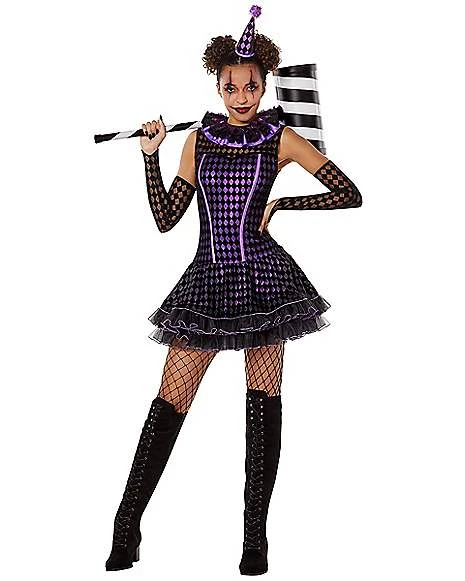 Bring the party to life in this dark clown costume! This clown costume includes figure-hugging dress with a flocked mesh skirt, a matching ruffle collar, arm warmers, and a traditional clown hat. An allover purple and black diamond print gives this clown ensemble a vintage feel. Have fun clowning around!