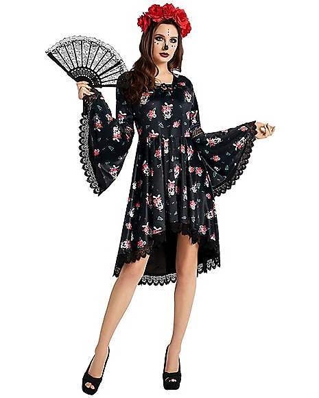 Celebrate your favorite holiday in style when you get all dressed up in this Adult Sugar Skull Darling Costume. You’ll look perfect for any Day of the Dead party wearing this outfit that features a black dress with skull pattern, red rose crown, and a handheld fan. You’ll love how authentic you look wearing this Day of the Dead costume.Â