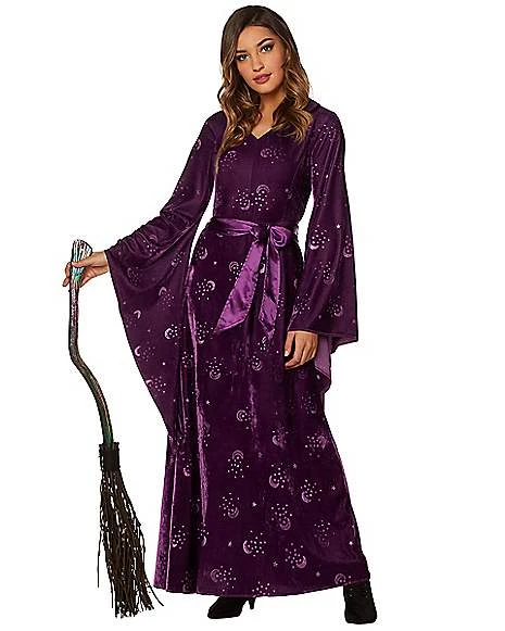 Add this velvet celestial robe to your Halloween costume and you’ll be ready to cast some spells. This velvet robe features moon and star print detail that will have you standing out in every crowd you enter. With long bell sleeves and an attached hood, this velvet robe is a must have for every spellbound costume.