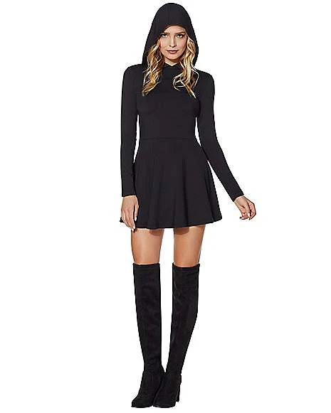 Create your very own Halloween look with this black hooded dress. You can turn yourself into a dark angel, a dark unicorn, or any other magical create you’d like! This comfortable dress is the perfect base for your perfect Halloween look.