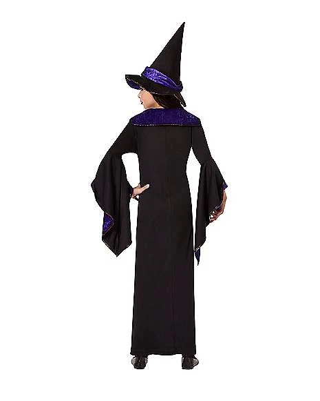 Make your magic mark this Halloween in this bewitching costume! Be the most stylish spell-caster on the block with this look which includes a beautiful black dress with a velvety purple belt and collar and, of course, a cute witch hat. Broomstick not included!