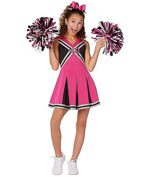 Where’s your team spirit? Get loud and proud in this pink and black cheerleader costume! A sporty, pleated dress and matching pom poms give this costume an authentic flair. Thoughtful details include a “cheer” megaphone chest patch, multi-tonal stripes, and an oversized bow. Go team!