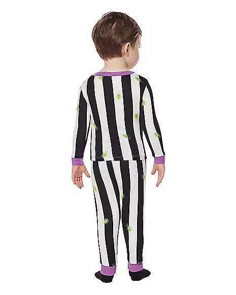 Beetlejuice, Beetlejuice, Beetlejuice! Snuggle up in ghoulish style with this Beetlejuice-inspired pajama set! This officially licensed pajama set, which includes a pajama shirt and pajama pants that resemble Beetlejuice’s iconic pinstripe suit, is the perfect choice for anyone looking to show their love for their favorite freelance bio-exorcist.