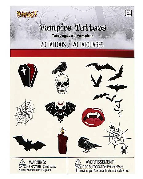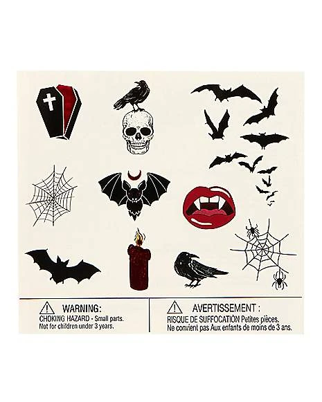 Add a fun element to your vampire look with these vampire temporary tattoos! These easy-to-use tattoos feature a variety of images, from a mouth with fangs to a coffin to a skull with a black bird on it, plus bats, a spider web, and a candle for lots of variety.